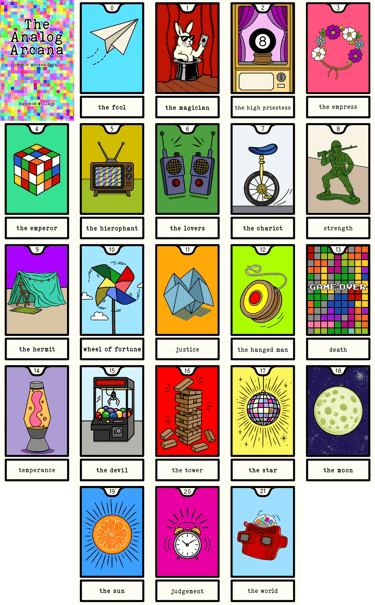 The Analog Arcana is a tarot deck that reimagines the Major Arcana through the lens of childhood nostalgia — a time when everything felt magical, tactile, and alive.