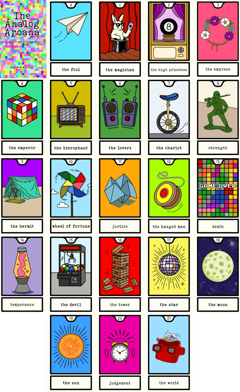 Created and illustrated by artist and educator Rainbow Willard, the deck blends playfulness with depth. It honors the intuitive spirit of classic tarot while celebrating the humor, color, and curiosity of growing up in an analog world.